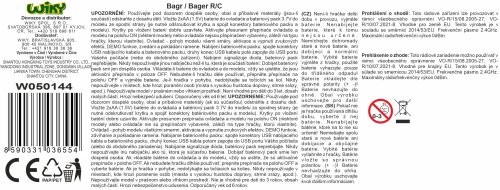 RC bager na diaľkové ovládanie. Realistický model so zvukovými efektmi a funkčným naberacím ramenom. Frekvencia 2,4 GHz. Ovládač ponúka jazdu vpred/vzad, otáčanie vľavo/vpravo, zvukové efekty s možnosťou vypnutia, tlačidlo DEMO, ovládanie zdvíhania a pokladania ramena. Veža bagru je možné otáčať manuálne. Súčasťou je batériový pack 3,7 V a USB kábel, ovládač funguje na 2x AA batérie (nie sú súčasťou). Rozmery bagru: 46 x 13 x 23 cm. Rozmery balenia: 48,5 x 26 x 19,3 cm. Nevhodné pre deti do 3 rokov. Vek: 6+