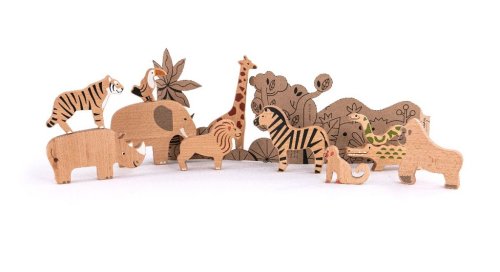 Koho môžete stretnúť v džungli? Tigra, gorila alebo tukana. Zvieratká boli navrhnuté v modernom minimalistickom štýle. Líšia sa veľkosťou. Niektoré majú hrúbku 18 mm a iné 13 mm, vďaka čomu ukazujú skutočný rozdiel vo veľkosti medzi jednotlivými druhmi. Figúrky perfektne padnú do rúk malého dieťaťa. Obal tejto sady je jedinečný. Kartón stačí narezať pozdĺž vyznačených zárezov a vytvoriť divokú dž ungli. Obsahuje : slona, gorilu, zebru, leva, tigra, nosorožca, hada, žirafu, krokodíla, tukana a opicu. Veľkosť figúrok: Slon: 14x10,6x1,8 cmGorila: 9,4x10x1,8 cmZebra: 10,2x11,6x1,8 cmLev : 11x8,5x1,8 cmTyger: 12,5x8x1,8 cmNosorožec: 14,5 : 14x14, 6x1,3 cmŽirafa: 9,4x19x1,3 cmKrokodíl: 17x 5x1,8 cmTukán: 6,6x5,7x1,3 cmOpice : 7x6x1,3 cm Jedinečnosť drevených hračiek spočíva v tom, že sú úplne. Spoločnosť Bajo ponúka mnoho hračiek lakovaných farbami, preto je ich prioritou kvalita a zdravotná nezávadnosť, ktorá je potvrdená certifikátmi. Kontrolované a testované sú tiež prvky vyrobené z plastu a kovu. Táto hračka a obal sú vyrobené z prírodných zdrojov a dajú sa ľahko recyklovať. Odporúčame povrch hračky čistiť iba vlhkou handričkou. Nevystavujte, prosím, túto hračku vysokým teplotám alebo vysokej vlhkosti, drevo sa za týchto podmienok môže ohýbať a deformovať. Spĺňa všetky európske bezpečnostné normy. Hlavné vlastnosti: bukové drevopodnecuje ku kreatívnej hre