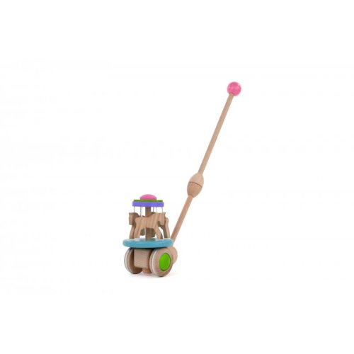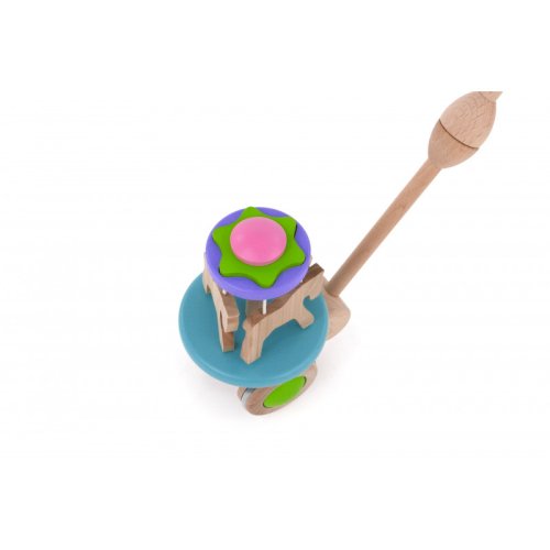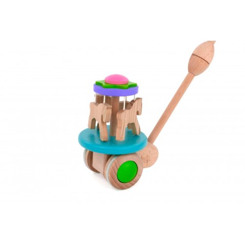 Kto ide do zábavného parku? Kone sa už točia na kolotoči. Ale ako? kone? Taký kolotoč nikde nie je. Zvieratá sa na ňom točia tak rýchlo, že sa začnú vznášať. Je to všetko kvôli odstredivým silám. Keď dieťa s jazdíkom chodí, kone rotujú, a keď dieťa zrýchli, zdvihnú sa. Pri hraní s touto hračkou zažíva mnoho „problémov“, vďaka ktorým môže spoznávať svet. Jedným z nich je fyzikálny zákon, založený na prenose energie. Po uvedení do pohybu sa aktivuje mechanizmus, ktorý spôsobí, že sa kolotoč otáča okolo svojej osi, čo sa premieta do odstredivých síl pôsobiacich na koníky. Hračka začína meniť svoj pôvodný vzhľad, čo dieťa zaujme a nabáda k hre. Rozvíja tiež hrubú motoriku zapojením pohybov tela a rúk. Navyše podporuje prvé kroky. Pogumované kolieska zaisťujú tichý chod na pevných podlahách Táto hračka a obal sú vyrobené z prírodných zdrojov a dajú sa ľahko recyklovať. Odporúčame povrch hračky čistiť iba vlhkou handričkou. Nevystavujte, prosím, túto hračku vysokým teplotám alebo vysokej vlhkosti, drevo sa za týchto podmienok môže ohýbať a deformovať. Spĺňa všetky európske bezpečnostné normy. Hlavné vlastnosti: podporuje pohybovú aktivitu rozvíja rovnováhu zábavnou formou pogumované kolieska pre tichý chod na pevných podlahách