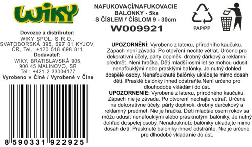 Balónik nafukovací 30cm - sada 5ks, s číslom 9