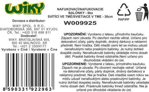 Balónik nafukovací 30cm - sada 6ks, svietiaca v tme
