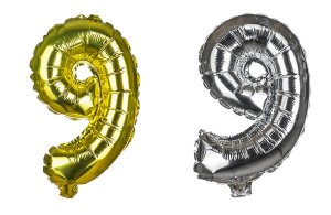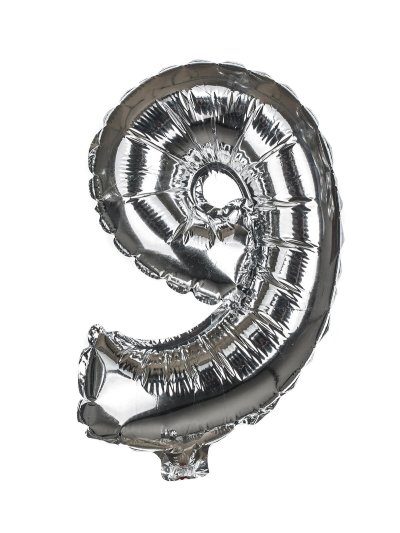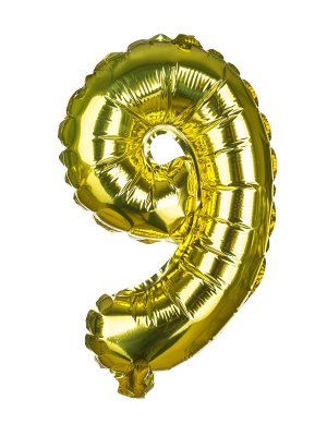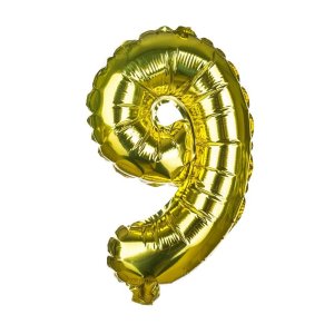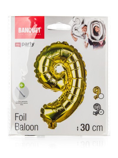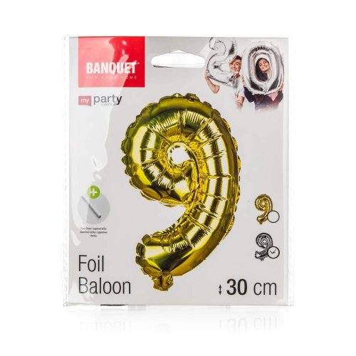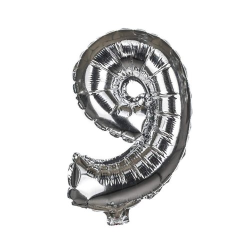 Balónik nafukovací fóliový číslo 9, je vysoký cca 30 cm, farebný mix: zlatá a strieborná farba. Súčasťou výrobku je papierová slamka na nafúknutie balónika a šnúrka na zavesenie. Výrobok využijete na oslave, záhradnú párty, pikniku a pod.