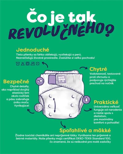 • Revolučné opakovane použiteľné plienky - neobsahujú škodlivé materiály a sú vybavené nastaviteľnými cvokmi, priedušnými absorpčnými tkaninami, vodeodolnou vrstvou a nepriepustnou konštrukciou.