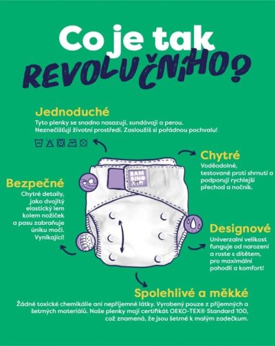 • Revolučné opakovane použiteľné plienky - neobsahujú škodlivé materiály a sú vybavené nastaviteľnými cvokmi, priedušnými absorpčnými tkaninami, vodeodolnou vrstvou a nepriepustnou konštrukciou.