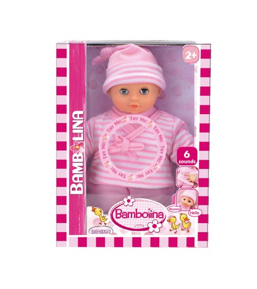 Bambolina je roztomilá bábika o veľkosti 20 cm, ideálna pre malé deti, ktoré sa chcú hrať na mamičku a starať sa o svoju bábiku. Bábika je vybavená 6 zvukmi, ktoré ju robia interaktívnou a zábavnou. Deti si tak môžu užívať rôzne situácie a scenáre, pri ktorých bábika vydáva zvuky, ktoré ju privedú k životu. Balenie obsahuje assort dvoch štýlov, takže si môžete vybrať medzi dvoma rôznymi variantmi. Bambolina je perfektný spoločník pre každodennú hru a rozvoj kreativity.