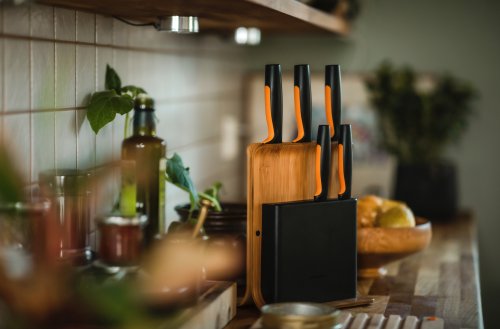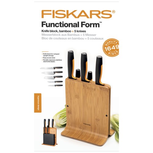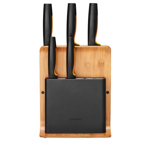 Dizajnový blok vyrobený z bambusu a plastu. Ideálne na bezpečné skladovanie nožov. Blok obsahuje 5 najdôležitejších nožov z radu Functional Form: okrajovací nôž, raňajkový nôž, nôž Santoku, veľký kuchársky nôž a nôž na pečivo. Výška: 37,1 cm, dĺžka: 20,2 cm, šírka: 14,2 cm. Hmotnosť: 1,07 kg. Pôvodné FIS číslo 1014211.