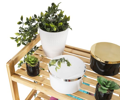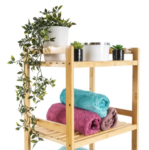 Bambus je prekvapivo ľahký, takže s celým stojanom s policami môžete ľahko manipulovať. Zároveň je ale dostatočne pevný, takže unesie aj väčšiu záťaž . Jednou z výborných vlastností bambusového dreva je navyše jeho veľká odolnosť voči vlhkosti a prirodzená odolnosť voči baktériám a plesniam , takže sa nemusíte obávať jeho umiestnenia v kúpeľni alebo práčovni.