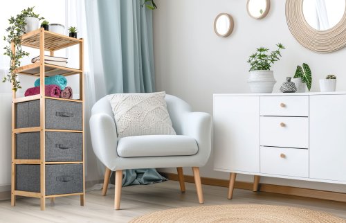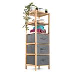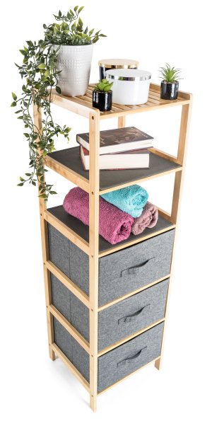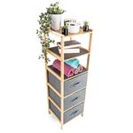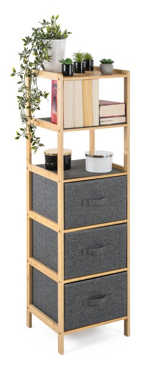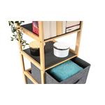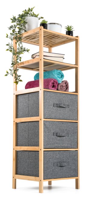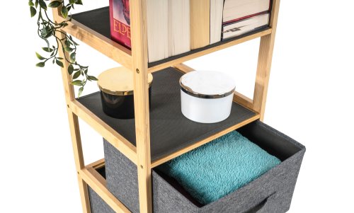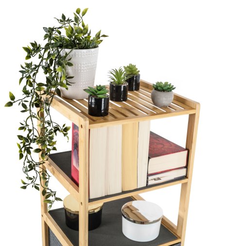Bambusový regál s výsuvnými látkovými zásuvkami dodáva interiéru príjemný prírodný dojem, pocit ľahkosti a prirodzenosti , zatiaľ čo jeho pevnosť a dlhá životnosť zaisťujú stabilitu a trvanlivosť .