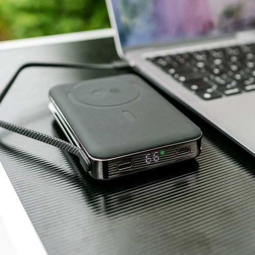 Nabíjajte až tri zariadenia naraz Powerbank vám umožní nabíjanie troch zariadení súčasne. Jedno za pomocou bezdrôtovej nabíjacej plochy Qi2, druhé potom pomocou integrovaného USB-C kábla a tretie cez USB-C port ku ktorému jednoducho pripojíte kábel.