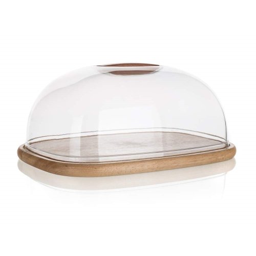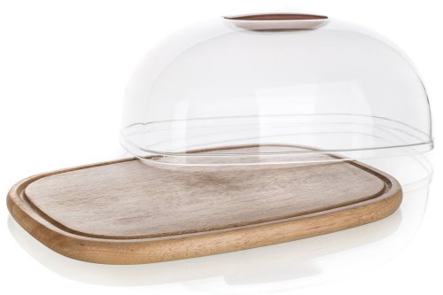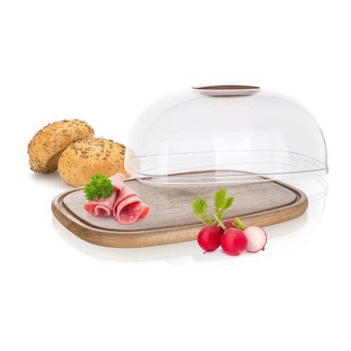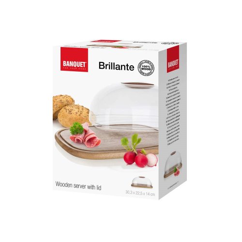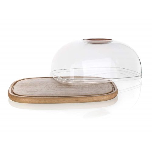 Doštička servírovacia s poklopom BRILLANTE s rozmermi 30,3 x 22,5 x 14 cm, podnos s ryhou z kvalitného gumovníkového dreva, poklop acryl s dreveným knobom.