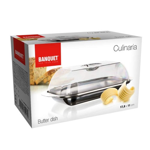 Dóza na maslo CULINARIA, rozmery dózy: dĺžka 17,8 cm, šírka 11 cm, výška 5,5 cm, materiál - nerez 430 (18/0, hrúbka 0,50 mm), plastové transparentné viečko.