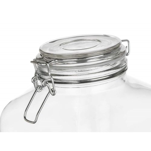 Sklenená hermetická dóza EREA 5 l so skleneným viečkom a kovovým zatváracím patentom, viečko je osadené silikónovým tesnením, drôtený systém uzáveru nie je vhodný do umývačky (nie je nerezový).