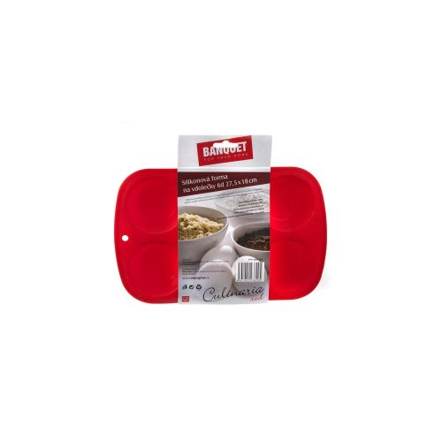Silikónová forma na muffiny 6 ks Red CULINARIA, rozmery: 27,5 x 18 x 3,2 cm. Forma je odolná vysokým teplotám do 240 st.C , možno ju používať do elektrickej aj mikrovlnnej rúry, neviaže chute ani pachy pokrmov, ľahko sa udržuje, možno umývať v umývačke riadu. Silikón je veľmi populárny materiál, ktorý pre svoje jedinečné vlastnosti našiel uplatnenie aj v kuchyni. Vyrábajú sa z neho rôzne druhy foriem na pečenie, vály a valčeky na cesto, stierky, mašlovačky, kuchynské náčinie a mnohé ďalšie výrobky.