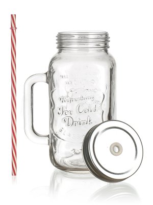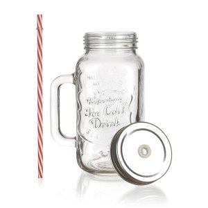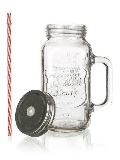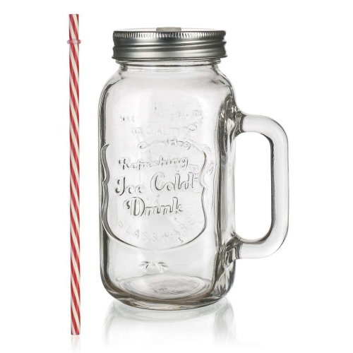 Sklenený hrnček s uchom je opatrený praktickým skrutkovacím plechovým viečkom striebornej farby a slamkou. Hrnček je ideálny na limonádu, ľadové čaje a koktaily. Skvele sa hodí na záhradnú slávnosť, letnú párty či svadbu.