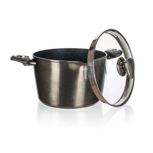Hliníkový liaty kovaný hrniec s výlevkou a so sklenenou pokrievkou METALLIC PLATINUM s nepriľnavým povrchom o rozmere 24 x 15,5 cm, vonkajší karbón metalický nástrek, hrúbka steny 3 mm, plne indukčné dno, soft-touch rukoväť a nerezový kn. Nepriľnavý povrch je veľmi tvrdý a odolný proti poškriabaniu. Hrniec je odolný proti nárazu.