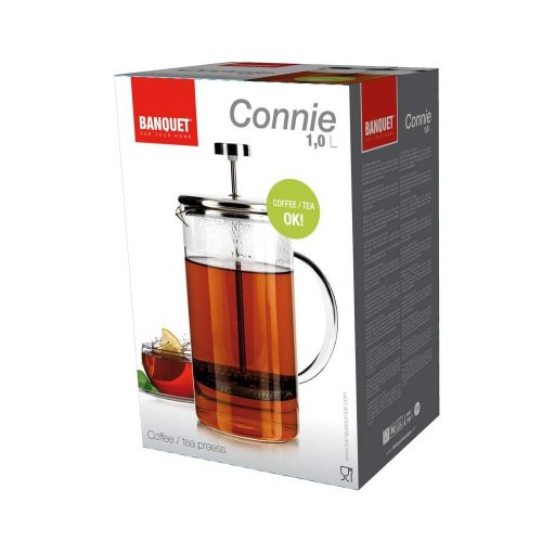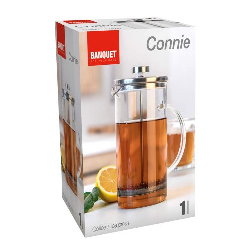 Kanvica na kávu CONNIE 1 l je sklenená kanvica s filtračným piestom z nerezovej ocele, nerez 18/8, sklo kanvice je určené na horúce nápoje - borosilikátové sklo, výška kanvice vrátane viečka - 20,2 cm.