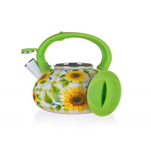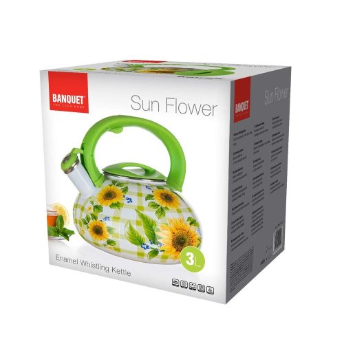 Smaltovaná kanvica pískacia 3 l SUN FLOWER je vyrobená z oceľového plátu s 2vrstvovým smaltovaným nástrekom a dekorom v štýle SUN FLOWER. Má plastové držadlo farebne ladené do dizajnu kanvice, snímateľnú píšťalu a dno opatrené piktogramami o použití kanvice.