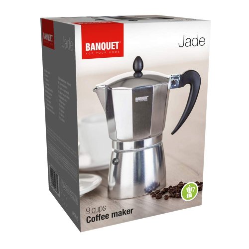 Kávovar JADE 9 šálok je tradičný kávovar na domácu prípravu chutnej silnej kávy. Je vhodný na použitie na plynových, elektrických a sklokeramických doskách. Hliníkové telo kávovaru už po niekoľkých šálkach získa patinu, ktorá je pre správnu chuť kávy nenahraditeľná. Kávovar je vybavený bezpečnostným ventilom. Využiteľný objem 400 ml. Kávovar nie je vhodný na umývanie v umývačke.
