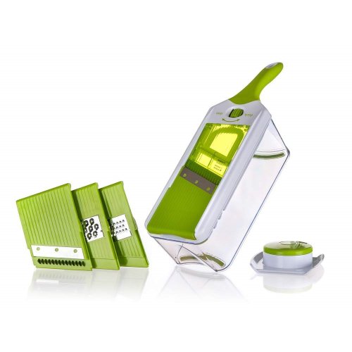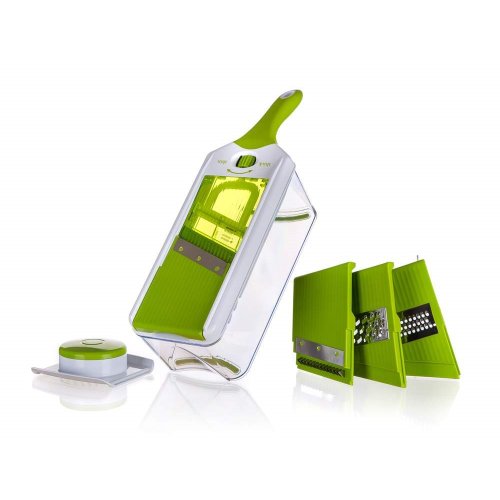 7dielny univerzálny krájač CULINARIA je všestranný pomocník do kuchyne. Balenie obsahuje: 1 x veko s držadlom, 1 x zásobník na nastrúhané potraviny, 1 x plátkovač, 1 x julienne krájač, 1 x strúhadlo, 1 x jemné strúhadlo, 1 x chránič.