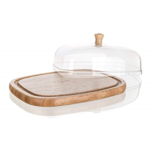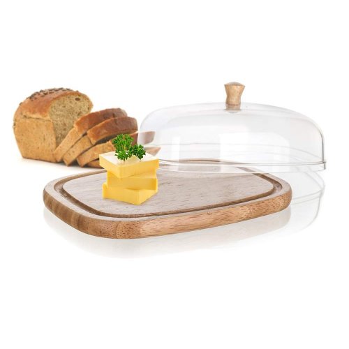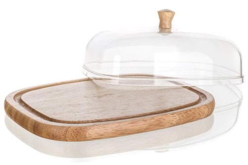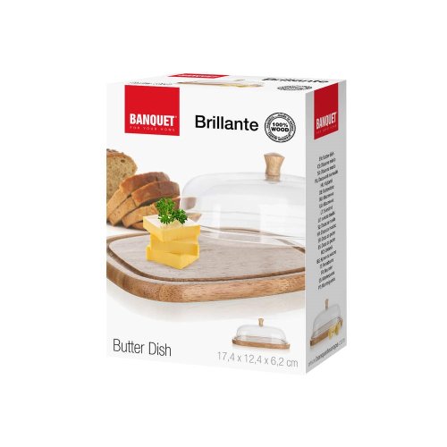 Dóza na maslo a syry BRILLANTE s rozmermi 17,4 x 12,4 x 6,2 cm, podnos s ryhou z kvalitného gumovníkového dreva, poklop acryl s dreveným knobom. Syr uzavretý poklopom na podnose zostane oveľa dlhšie čerstvý a neosychá.