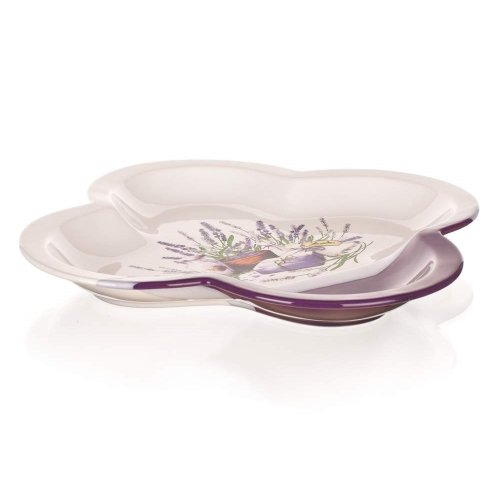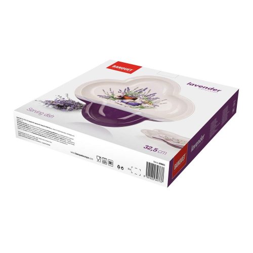 Servírovacia misa štvorlístok 32 cm LAVENDER, materiál - keramika, fialovo-biela glazúra s dekorom levandule. Misu je možné umývať v umývačke riadu.