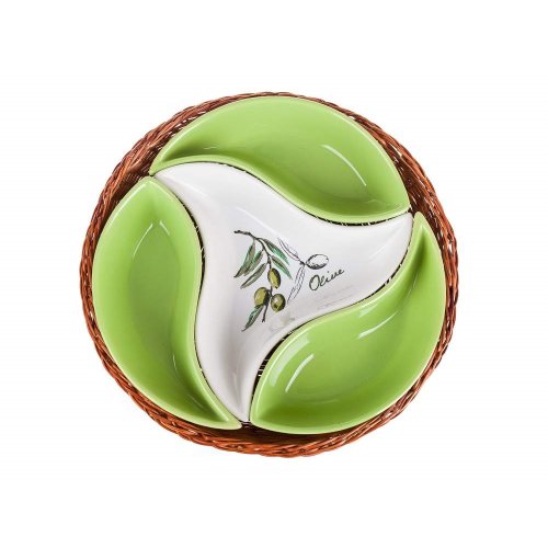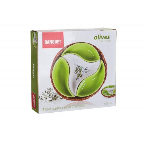 Misa v košíku OLIVES 23 cm, 4 diely v prútenom košíku 21,6 cm obsahuje: 3x malá miska, 1x veľká miska, 1x prútený košík. Ide o obľúbenú kolekciu keramiky s dekorom olivy, ktorú môžete doplniť zo širokého sortimentu.
