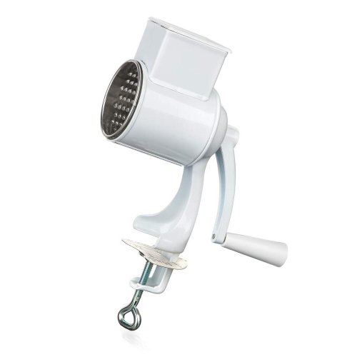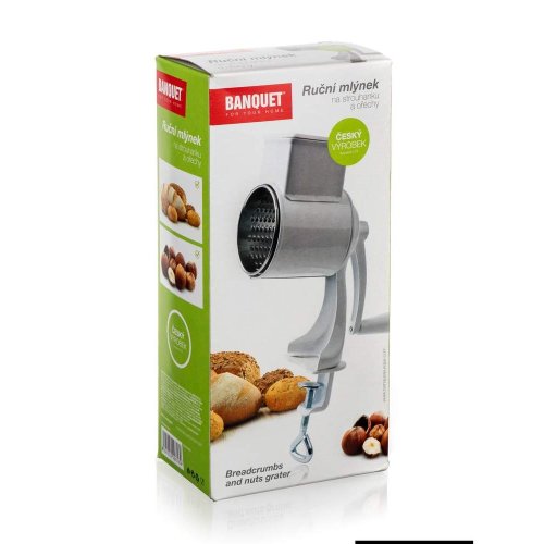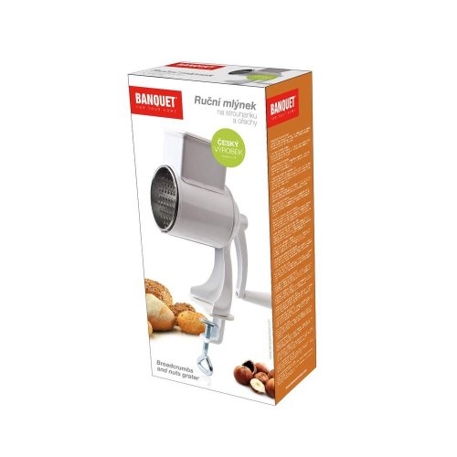 Mlynček na strúhanku s celkovou výškou 30,5 cm, bubon z pocínovaného plechu s priemerom 7,5 cm, kovové telo mlynčeka je ošetrené práškovou farbou v bielom odtieni. Vyrobené v Českej republike.