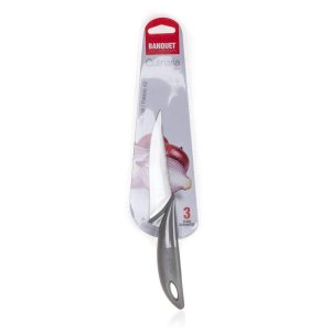 Praktický nôž CULINARIA Grey o celkovej dĺžke 22cm, oceľové ostrie (dĺžka 12 cm, šírka 1,5 cm), plastová rukoväť (dĺžka 10 cm). Oceľové nože patria medzi nenahraditeľných pomocníkov v každej kuchyni. Výber vhodného noža nám uľahčí krájanie či porciovanie potravín. Kolekcia nožov BANQUET ponúka široký výber nožov mnohých tvarov, veľkostí a účelu použitia.