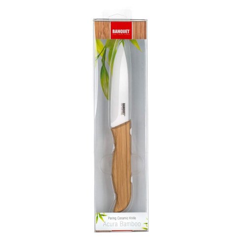 Nôž praktický keramický ACURA BAMBOO 20 cm, keramická čepeľ (oxid zirkónový) dĺžky 10 cm, hrúbka ostrie 1,6 mm, bambusová rukoväť. Ostrie keramického noža je vyrobené z keramického materiálu zvaného oxid zirkóničitý. Táto zlúčenina vyniká vysokou pevnosťou a odolnosťou. Ergonomická rukoväť z TPR s protišmykovou úpravou. Nôž je veľmi odolný proti škvrnám a ľahko sa čistí. Čepeľ do seba neprepustí žiadnu z kyselín obsiahnutých v potravinách. Vitamíny sa vďaka keramickej čepeli z potravín nestrácajú. Mäso, zelenina či ovocie sa nelepí na nôž. Nôž má nízku hmotnosť a vyvážené ťažisko, ľahko sa s ním manipuluje pri práci. Keramické nože sú tvrdšie ako kovové, preto nepotrebujú každodenné prebrusovanie ocieľkou ako oceľové. Daňou za vysokú tvrdosť je ich krehkosť, preto sa neodporúča kosiť s nimi napr. kosti, lámať nôž pri krájaní a vyvarovať sa pádu noža na zem.