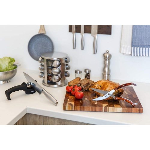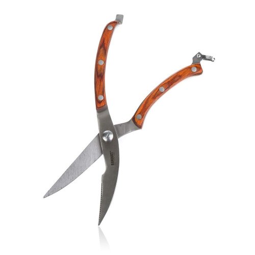 Nožnice na hydinu CULINARIA 25,5 cm sú vybavené zahnutým ostrím pre ľahkú manipuláciu a rýchle porciovanie hydiny. Nožnice sú vyrobené z ocele, hladké ergonomické rukoväte sú vyrobené z dreva v hnedej farbe a na konci sú opatrené poistkou.