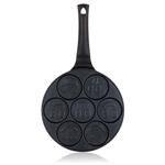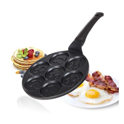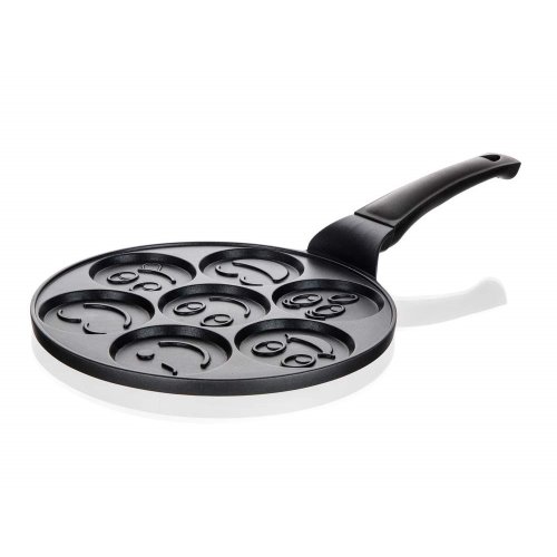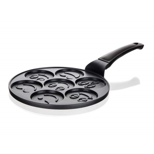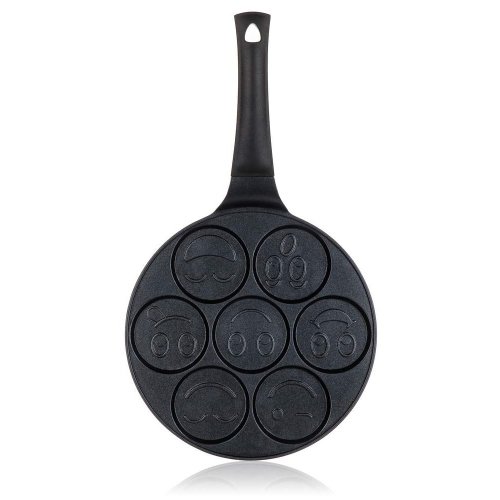 Hliníková liata panvica na 7 lievancov ALIVIA Smile 26 cm má vnútorný nepriľnavý povrch a je vhodná na všetky typy sporákov vrátane indukcie. Lívanečník s detskými motívmi na dne panvy, môžeme použiť na prípravu lievančekov, volských ôk a zemiakov s priemerom 8 cm.