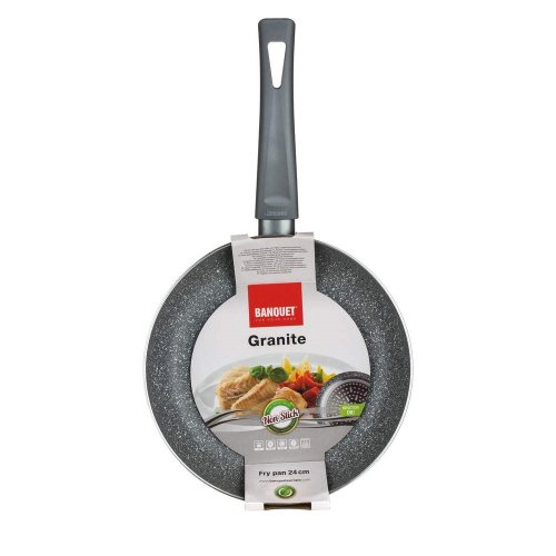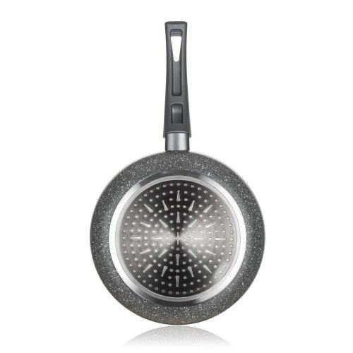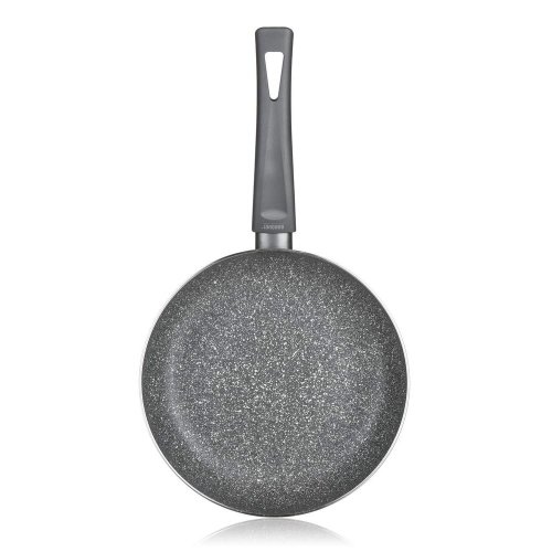 Hliníková presovaná panvica GRANITE 24 x 5 cm s nepriľnavým 2vrstvovým povrchom v granitovom dekore a šedou bakelitovou rukoväťou so soft-touch povrchovou úpravou. Panvica je vhodná na všetky typy varných dosiek vrátane indukcie.