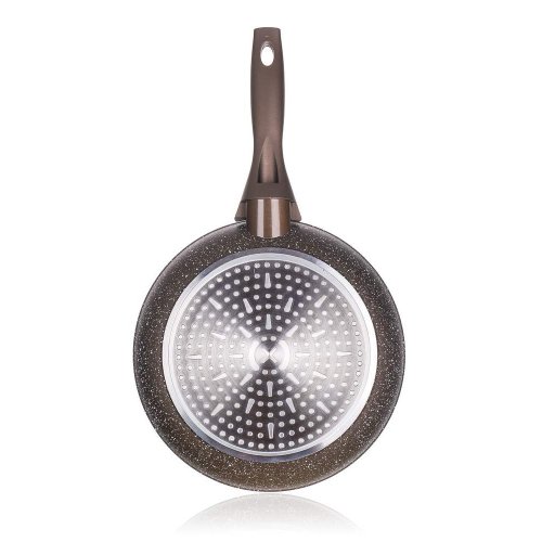 Hliníková liata kovaná panvica PREMIUM DARK BROWN s nepriľnavým povrchom, rozmer 24 x 4,8 cm, hnedý granitový dekor, hrúbka steny 3 mm, plne indukčné dno, soft-touch rukoväť. Nepriľnavý povrch je veľmi tvrdý a odolný proti poškriabaniu. Panvica je odolná proti nárazu a deformácii tvaru. Vysoká tepelná vodivosť zaisťuje rýchle a ekonomické varenie - dlho drží teplotu.