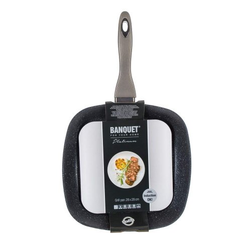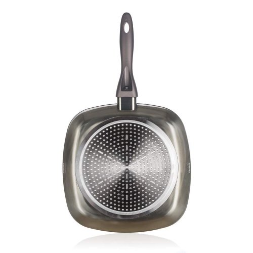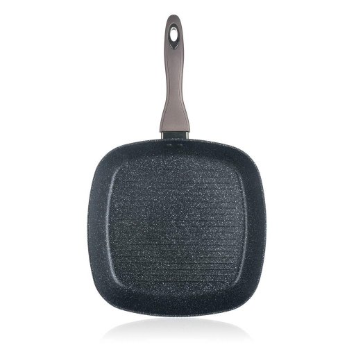 Hliníková liata kovaná steaková panvica METALLIC PLATINUM s nepriľnavým povrchom, 28 x 28 x 4,8 cm, vonkajší karbón metalický nástrek, hrúbka steny 3 mm, plne indukčné dno, soft-touch rukoväť. Nepriľnavý povrch je veľmi tvrdý a odolný proti poškriabaniu. Panvica je odolná proti nárazu a deformácii tvaru. Vysoká tepelná vodivosť zaisťuje rýchle a ekonomické varenie - dlho drží teplotu.