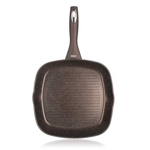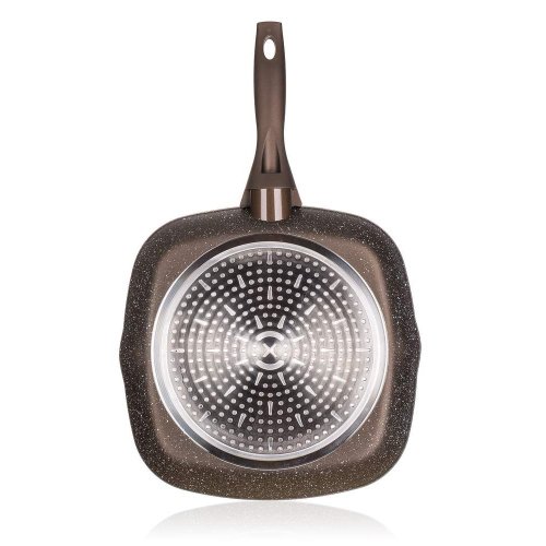 Hliníková liata kovaná steaková panvica PREMIUM DARK BROWN s nepriľnavým povrchom, rozmer 28 x 28 x 4,8 cm, hnedý granitový dekor, hrúbka steny 3 mm, plne indukčné dno, soft-touch rukoväť. Nepriľnavý povrch je veľmi tvrdý a odolný proti poškriabaniu. Panvica je odolná proti nárazu a deformácii tvaru.