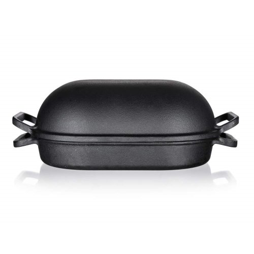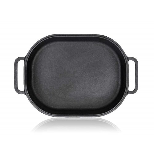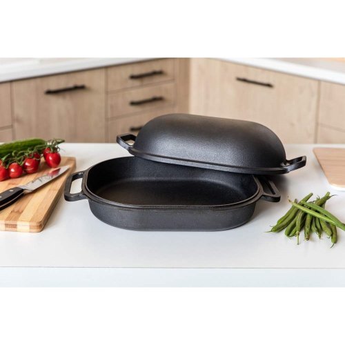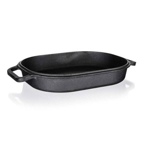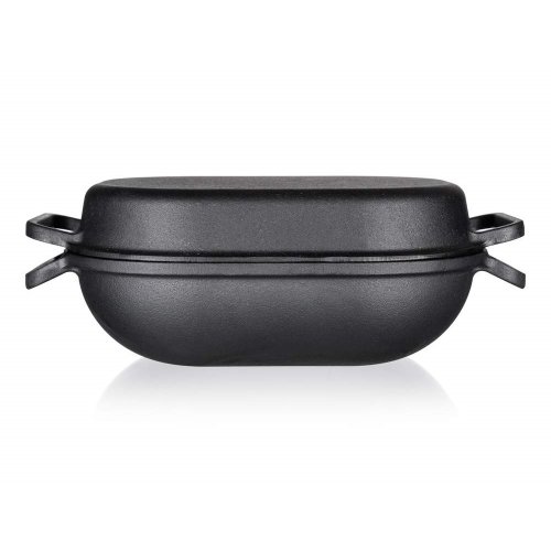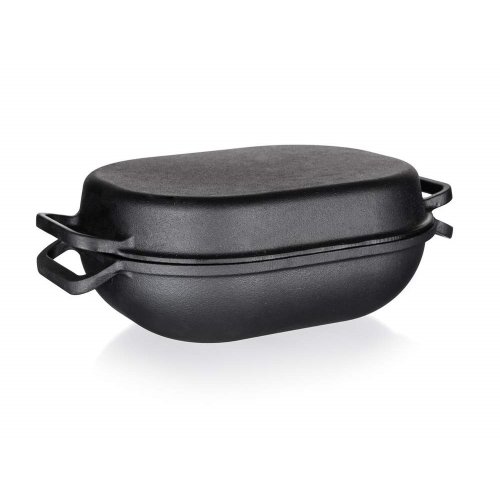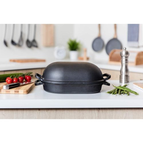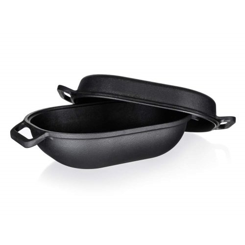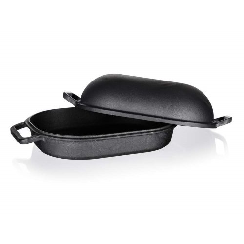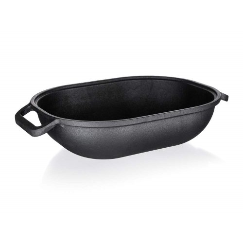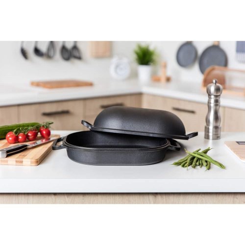 Pekáč liatinový EXCELLENT oválny s vekom s objemom 3 + 4 la rozmeru 39 x 26 x 14 cm v čiernej farbe. Liatinový pekáč je ideálny na pečenie a zapekanie v rúre, rovnako ako na varenie, dusenie či vyprážanie na platničke sporáka. Liatina je na varenie a pečenie úplne ideálna. Masívny materiál, ktorý akonáhle sa nahreje, vydrží dlho a rovnomerne rozvádza teplo, vďaka ktorému sa pokrm v liatinovom pekáči upečie rovnomerne, za kratšiu dobu a úspornejšie. Pred prvým použitím naneste na povrch pekáča rastlinný olej a postupne ho začnite ohrievať v rúre (začnite na miernom ohni a pomaly zvyšujte teplotu). Zapečením oleja získa výrobok svoju nepriľnavosť.