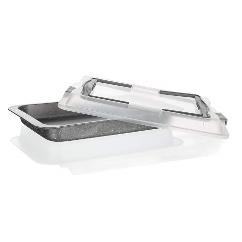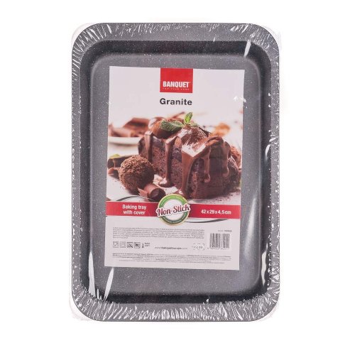 Plech s umelým vekom Granite 42x29x4, 5 cm, hrúbka dna aj stien 0,4 mm. Pekáče a formy na pečenie s nepriľnavým povrchom sú nevyhnutným pomocníkom v každej kuchyni. Nepriľnavý povrch XYNFLON je vyrobený na báze PTFE (polytetrafluóretylén), je vysoko odolný, má prvotriedne antiadhézne vlastnosti a ľahko sa udržuje.