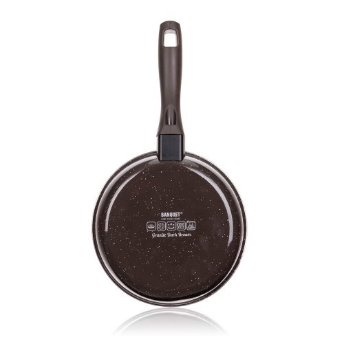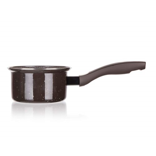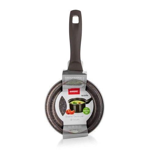 Smaltovaná rajnica o rozmere 14 x 6,5 cm Granite Dark Brown, hrúbka materiálu: 0,8 mm, má 2vrstvový vnútorný nepriľnavý povrch a vonkajší smaltovaný povrch Dark Brown. Rukoväť je vyrobená z bakelitu so soft touch povrchovou úpravou a dno výrobku je opatrené piktogramami na použitie.