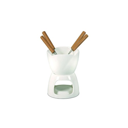 6dielna sada Fondue COLLEZIONE BIANCA, sada obsahuje: 1x keramickú misku s priemerom 10,5 cm a výškou 8 cm, 1x keramický stojan na sviečku (priemer 10,5 cm, výška 7,5 cm), 4x nerezovú vidličku dĺžky 17,5 s bambusovou rukoväťou.