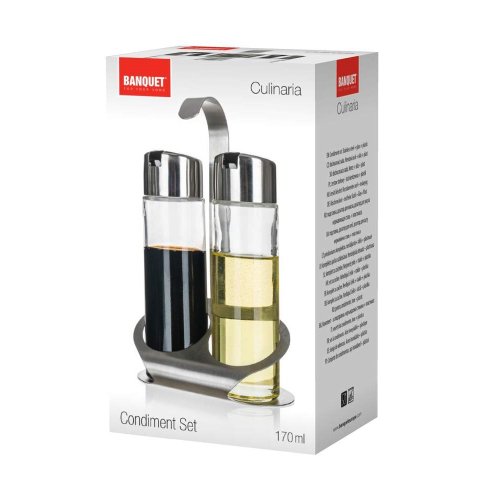 Sada dochucovacia CULINARIA 170 ml, 3 ks je vhodná do domácnosti aj gastro prevádzky. Veko: nerez 18/8 a plast PP a silikónové tesnenie, hrúbka nerezu 0,40 mm, dozy: sklo, stojan nerez 18/0, základňa: 1,00 mm, držadlo 1,5 mm.