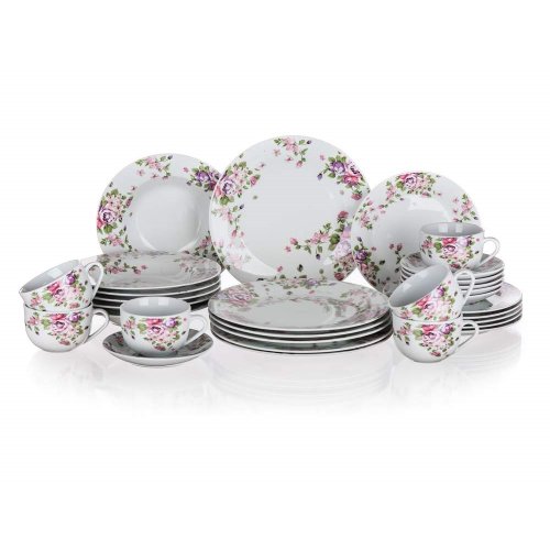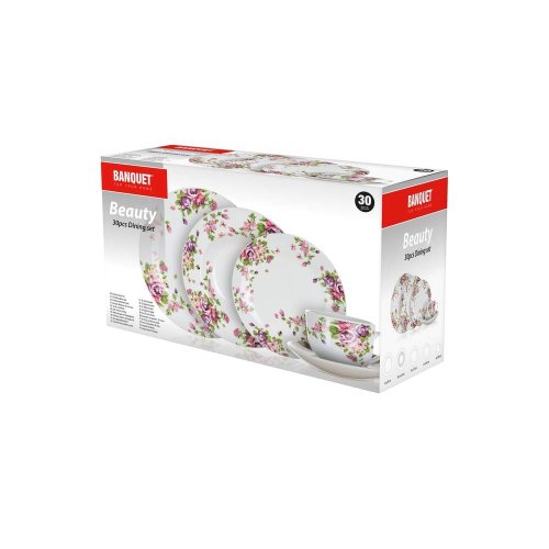 30dielna jedálenská súprava s tradičným dekórom BEAUTY sa hodí pre každé stolovanie. Sada obsahuje: 6 x hlboký tanier 21,5 cm, 6 x plytký tanier 24 cm, 6 x dezertný tanier 19 cm, 6 x podšálka 15,5 cm, 6 x šálka 220 ml, materiál: porcelán. Riad je možné používať do mikrovlnnej rúry a umývať v umývačke riadu.