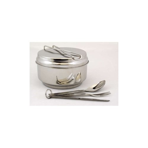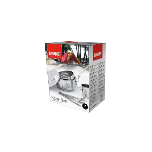 7dielna kempingová súprava STORE LINE obsahuje - 1x veľký ešus s priemerom 15 cm so sklopným držadlom a viečkom, objem nádoby 1,4 l, 1x malý ešus 13 cm so sklopným držadlom, objem 1 l, 1x hrnček s priemerom 7 cm a objemom 1 nôž. Sada je vyrobená z nerezu.