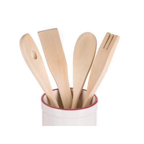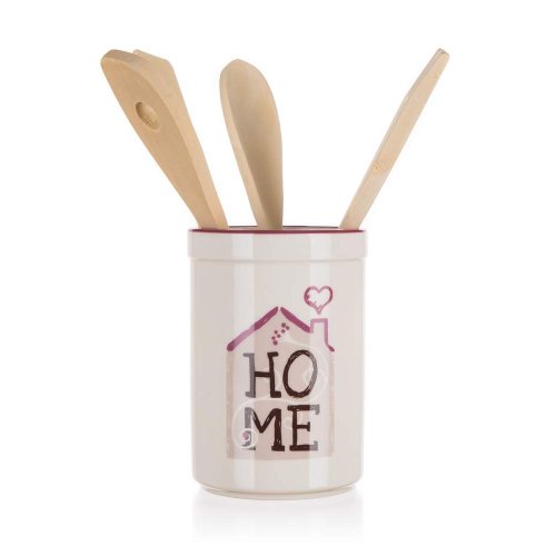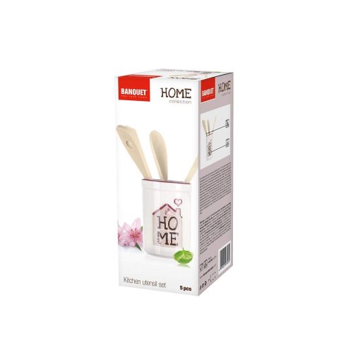 5dielna sada kuchynského náčinia s dekorom HOME obsahuje: 1 keramickú dózu 13,5 cm a 4 rôzne drevené varešky 25 cm. Možno použiť do umývačky, ale na zachovanie dokonalého vzhľadu odporúčame umývať ručne. V ponuke máme ďalšie produkty z kolekcie HOME.