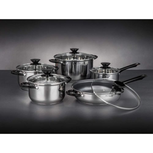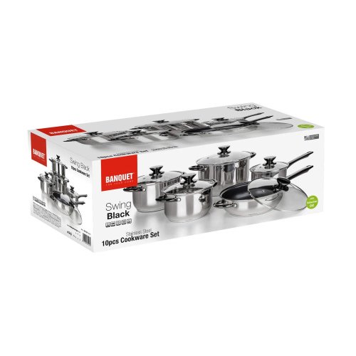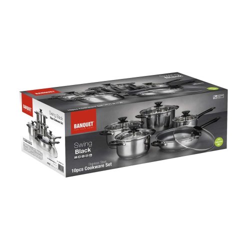 Sada nerezového riadu SWING Black 10 ks obsahuje: rajnicu 16 x 9 cm s pokrievkou, hrniec 18 x 10,5 cm s pokrievkou, hrniec 20 x 11,5 cm s pokrievkou, hrniec 24 x 13,5 cm s pokrievkou, panvica s nepriľnavým povrchom 24 x 6,5 cm s pokrievkou. Riad je možné používať na všetky typy sporákov. Hrúbka dna: 0,38 mm nerez / 0,5 mm hliník / 1 mm železo / 0,5 mm hliník / 0,38 mm indukčný protektor. Pokrievky sú vyrobené z odolného skla a majú otvor na paru pre dokonalú kontrolu nad varením. Povrchová úprava nerezu lesk (vnútri aj zvonku). Knoby a držadlá sú s farebnou úpravou v čiernej farbe. Riad sa ľahko udržuje, možno umývať v umývačke. Držadlá sú k hrncom naskrutkované.