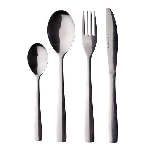 24dielna sada príborov DESMA. Sada obsahuje: 6x polievkovú lyžicu, 6x vidličku, 6x jedálenský nôž a 6x čajovú lyžičku. Povrchová úprava lesk, sila antikora: lyžica 1,8mm, vidlička 1,8mm, čajová lyžička 1,5mm, nôž 3mm.