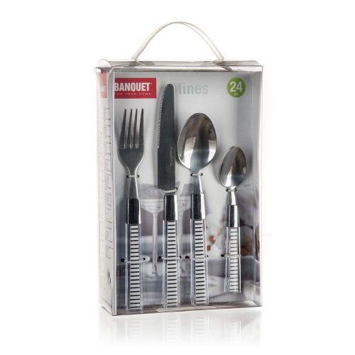 Sada príborov LINES 24 dielov obsahuje: 6x polievkovú lyžicu, 6x vidličku, 6x jedálenský nôž a 6x čajovú lyžičku. Povrchová úprava lesk, nerez 18/0 o hrúbke 1,8 mm, plastové držadlo s dekorom. Príbory nie sú vhodné do umývačky riadu.