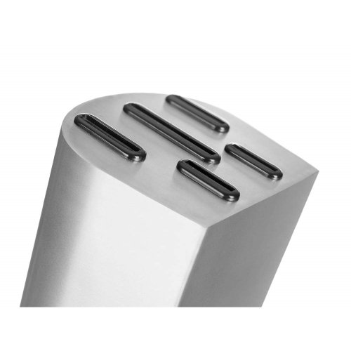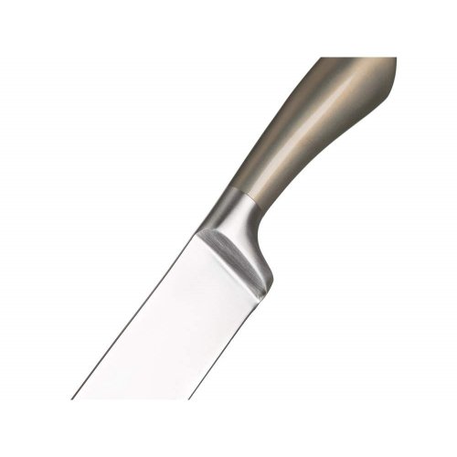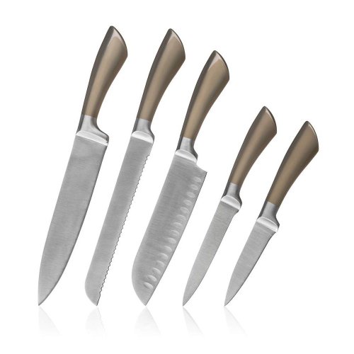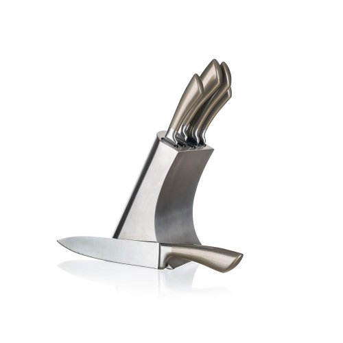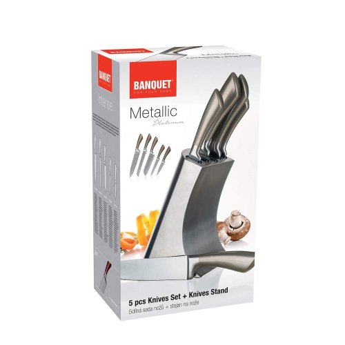 Súprava nožov METALLIC Platinum, 5 ks s nerezovým stojanom. Súprava obsahuje nôž kuchársky 33,5 cm, nôž santoku 30,5 cm, nôž na chlieb 33,5 cm, nôž univerzálny 23,5 cm, nôž praktický 21 cm a nerezový stojan. Nože sú vhodné na každodenné použitie. Oceľové nože patria medzi nenahraditeľných pomocníkov v každej kuchyni. Bez kvalitného noža si možno len ťažko predstaviť varenie. Nože rozširujú rad METALLIC.