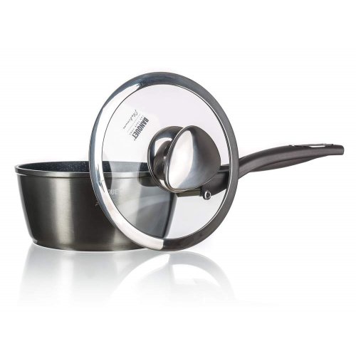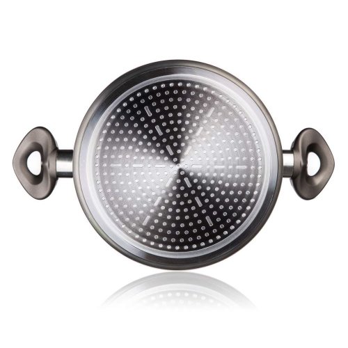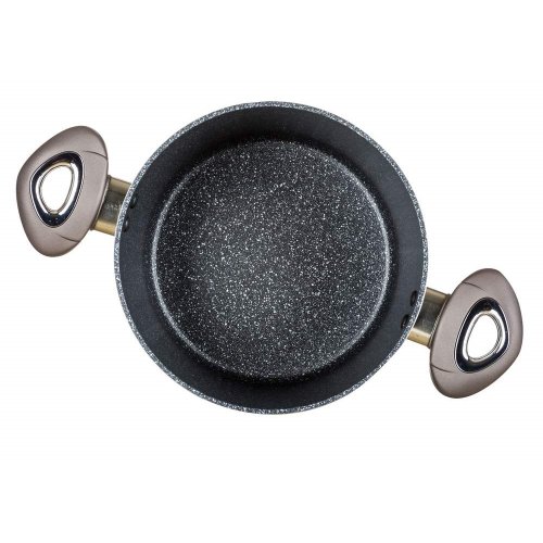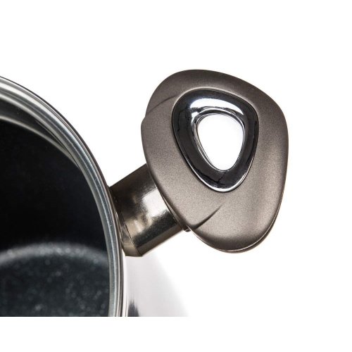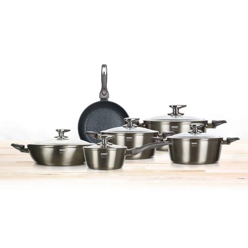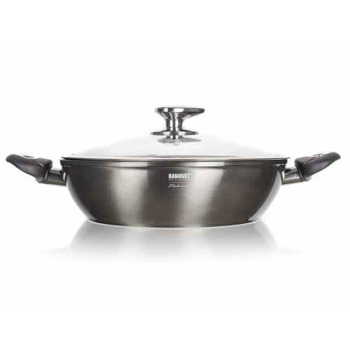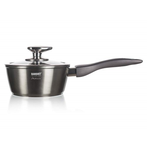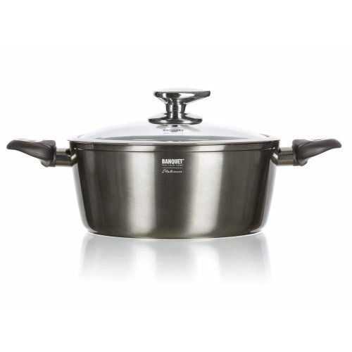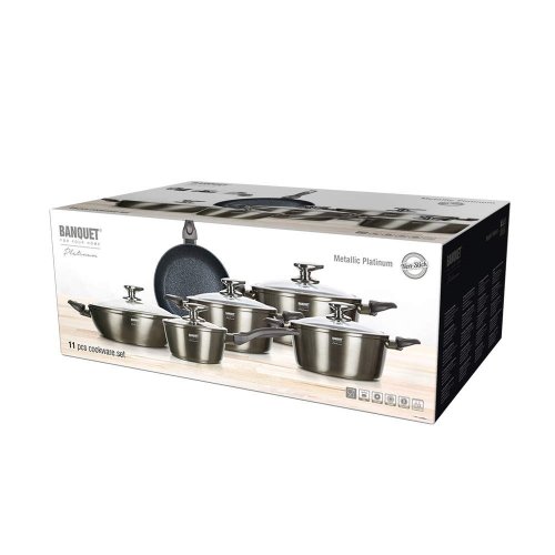 Súprava hliníkového liateho kovaného riadu METALLIC PLATINUM 11 ks obsahuje: rajnicu so sklenenou pokrievkou 16 cm, 1,25 l, hrnce 20 cm, 2,2 l, hrniec 24 cm 4,2 l, hrniec 28 cm, 6,7 l so sklenenou pokrievkou a nerez knobom, nízky hrniec so skl. pokrievkou 28 x 7,5 cm, 3,7 l, panvica 26 cm vonkajší karbón metalický nástrek, hrúbka steny 3 mm, plne indukčné dno, soft-touch rukoväť. Nepriľnavý povrch je veľmi tvrdý a odolný proti poškriabaniu. Výrobky v sade sú odolné proti nárazu a deformácii tvaru. Vysoká tepelná vodivosť zaisťuje rýchle a ekonomické varenie - dlho drží teplotu.