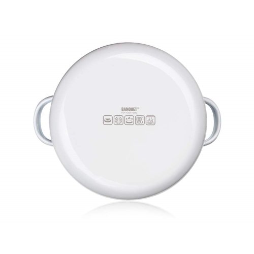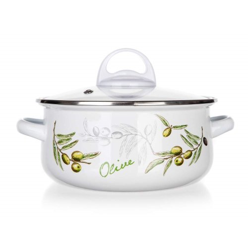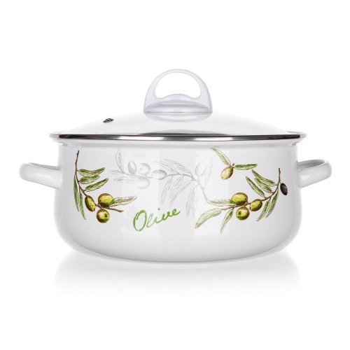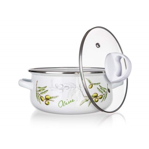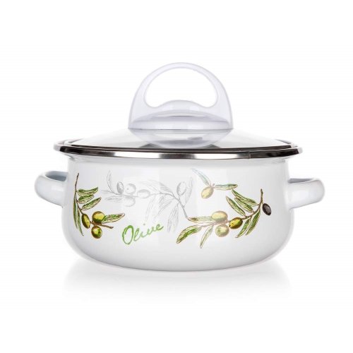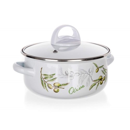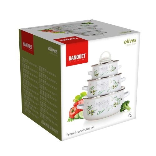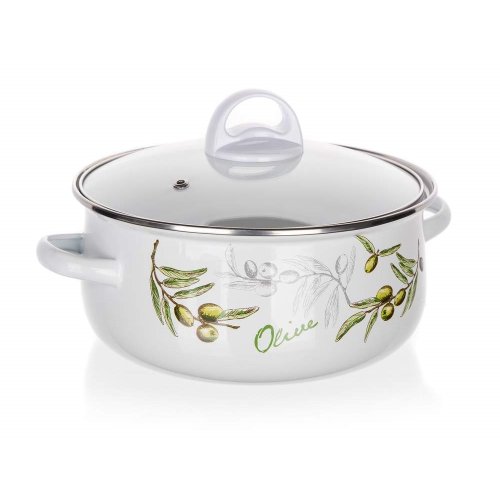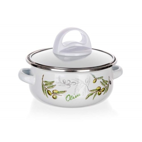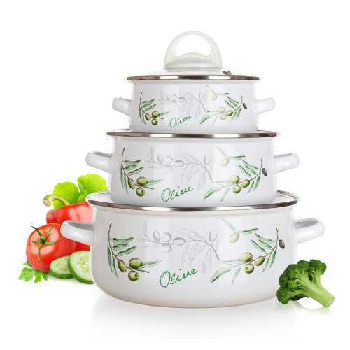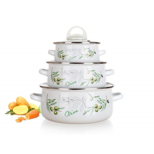 6dielna sada smaltovaných hrncov so sklenenou pokrievkou OLIVES, vhodné na varenie rôznych pokrmov. Hrniec môžete použiť do rúry, bez sklenenej pokrievky, ktorá je opatrená plastovým knobom. Súprava obsahuje: hrniec 14 x 7 cm, 18 x 8,5 cm, 22 x 10,7 cm. Potlač dna obsahuje opodvídajúce piktogramy.