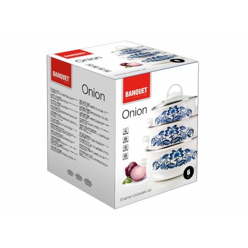 6dielna sada smaltovaného riadu ONION obsahuje 3 hrnce so sklenenými pokrievkami: objem 0,9 l (priemer 16 cm, výška 7,4 cm), objem 1,3 l (priemer 18 cm, výška 8,3 cm), objem 1,9 l (priemer 20 cm, výška 8,9 cm). Hrnce je možné používať na všetky typy varných dosiek mimo indukcie.